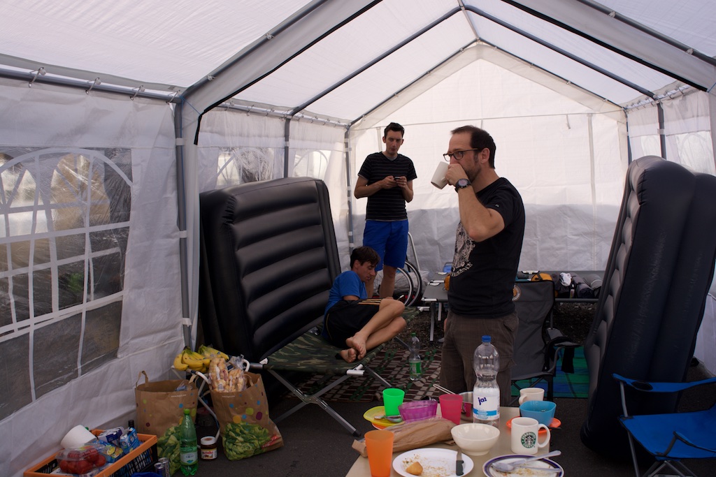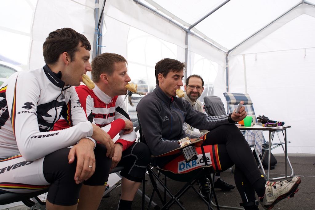 …diesesmal ohne Rollschuhe sollte es sein. Am letzten Wochenende waren wir, Robert, Sören, Markus, Conny, Jenny und ich am Nürburgring um das 24h Rad am Ring (Jenny das Jedermannrennen und Conny als Betreuung fürs Team) Rennen mitzumachen. Eine ziemlich coole Veranstaltung, die Strecke (26km) mit einem echt krassen Profil (siehe unten). Leider hatten wir nicht so viel Glück mit dem Wetter, die Nacht vom Freitag zum Samstag hat es quasi durchgeregnet und gestürmt wie verrückt, das ganze hat sich bis in den Samstag nachmittag durchgezogen so das der Veranstalter dann beschlossen hat, dass Rennen erst 20:00 Uhr zu starten und das Jedermannrennen zum Unglück von Jenny zu streichen. Wir waren dann quasi 24 Stunden damit beschäftigt unser Zelt abzudichten und am Boden zu halten…Am Samstag Abend war die Strecke aber trocken und gut zu fahren, Sonntag war das Wetter sogar wirklich fantastisch. Interessant sind die Geschwindigkeiten die gefahren werden und die Erfahrung im Dunklen zu radeln, bei Nacht werden auf der ganzen Strecke genau 3 kritische Stellen beleuchtet, ansonsten hat man besser ein ordentliches Licht am Start 😉 Fürs erste Mal haben wir uns glaub ich mit Platz 72 ganz gut geschlagen, hart war danach noch am Sonntag nach Hause zu fahren, würde ich beim nächsten Mal anders machen, man ist einfach nach 48h ohne richtigen Schlaf echt durch.